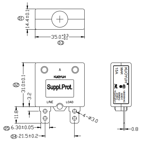 額定電流(rating):3A-50A 輸入電壓(Input Power):125VAC/250VAC/32VDC 50-60Hz 耐電壓強度(Withstand voltage strength):1500VAC/1min 漏電電流≤0.5mA(1500VAC/min,the leaked current is less than≤0.5mA) 絕緣電阻(Insulation Resistance):500VDC1Min≥100MΩ 額定短路能力(Rated short-circuit capacity):125VAC/1000A,250VAC/1000A 額定通斷能力(Rated breaking capacity):6倍額定電流(6 times rated current) 復(fù)位方式(reset):自動復(fù)位(Auto Reset) 復(fù)位時間(Reset Time):60s"內(nèi)回復(fù)(Within 60s") 脫扣特性(Tripping characteristics) 測試環(huán)境溫度(The test environment temperature):25℃±3℃ 額定電流200%(200% of Ratcd Currcnt):5-40s" 內(nèi)脫扣(5-40s" Seconds Trip) 額定電流150%(150% of Rated Current):一個小時內(nèi)脫扣(Trip within 1 Hour) 額定電流100%(100% of Rated Current):保持不脫扣(Hold,No Trip) |