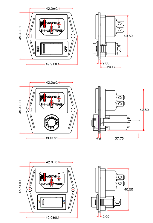 QN14系列 過(guò)載+開(kāi)關(guān) 額定電流(rating): QN14 15A 125/250Vac 介電強(qiáng)度(Withstand voltage strength): >1500VAC/1min 絕緣電阻(Insulation Resistance): >100MOHM (DC 500V) 工作環(huán)境(Operating Ambient Temperature): -10℃ to +60℃