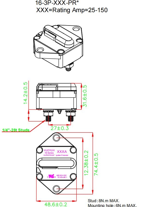 額定電流(Current rating range):30A-150A 額定電壓(Input voltage rating ):12/24/32/48VDC 復(fù)位方式(Reset): 手動(dòng)復(fù)位(Manual Push Reset) 限制短路電流(Interrupting capacity): 2000A/32VDC Type I 2000A/14VDC Type II 1500A/48VDC Type III 介電強(qiáng)度(Dielectric Strength):>1500VAC/min 絕緣電阻(Insulation Resistance):>100MOHM(DC 500V) 防護(hù)等級(jí)(Degree of protection):IP66 復(fù)位時(shí)間(Reset-Time):<60sec 工作環(huán)境溫度(Operating Temperature Rating):-30℃-80℃ 儲(chǔ)存溫度(Storage Temperatur Rating):-30℃-140℃ |