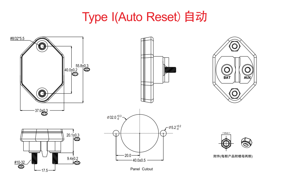 額定電流(rating):10A-60A 輸入電壓(Input Power):125VAC/250VAC/32VDC 50-60Hz 耐電壓強(qiáng)度(Withstand voltage strength):1500VAC/1min 漏電電流≤0.5mA(1500VAC/min,the leaked current is less than≤0.5mA) 絕緣電阻(Insulation Resistance):500VDC1Min≥100MΩ 額定短路能力(Rated short-circuit capacity):125VAC/1000A,250VAC/1000A 額定通斷能力(Rated breaking capacity):6倍額定電流(6 times rated current) 復(fù)位方式(reset):手動(dòng)復(fù)位(Manual Push Reset)/自動(dòng)復(fù)位(Auto Reset) 復(fù)位時(shí)間(Reset Time):60s"內(nèi)回復(fù)(Within 60s") 脫扣特性(Tripping characteristics) 測(cè)試環(huán)境溫度(The test environment temperature):25℃±3℃ 額定電流200%(200% of Ratcd Currcnt):8-40s" 內(nèi)脫扣(8-40s" Seconds Trip) 額定電流150%(150% of Rated Current):一個(gè)小時(shí)內(nèi)脫扣(Trip within 1 Hour) 額定電流100%(100% of Rated Current):保持不脫扣(Hold,No Trip) |