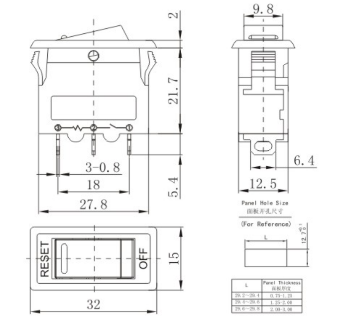 額定電流(rating):3A-16A 輸入電壓(Input Power):125VAC/250VAC/50VDC 50-60Hz 耐電壓強度(Withstand voltage strength):1500VAC/1min 漏電電流≤0.5mA(1500VAC/min,the leaked current is less than≤0.5mA) 絕緣電阻(Insulation Resistance):500VDC1Min≥100MΩ 額定短路能力(Rated short-circuit capacity):125VAC/1000A,250VAC/1000A 額定通斷能力(Rated breaking capacity):6倍額定電流(6 times rated current) 復(fù)位方式(reset):手動復(fù)位(Manual Push Reset) 復(fù)位時間(Reset Time):60s"內(nèi)回復(fù)(Within 60s") 脫扣特性(Tripping characteristics) 測試環(huán)境溫度(The test environment temperature):25℃±3℃ 額定電流200%(200% of Ratcd Currcnt):5-30s" 內(nèi)脫扣(5-30s" Seconds Trip) 額定電流150%(150% of Rated Current):一個小時內(nèi)脫扣(Trip within 1 Hour) 額定電流100%(100% of Rated Current):保持不脫扣(Hold,No Trip) |